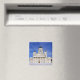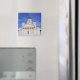 En souvenir-magnet med katedral i Helsingfors (Helsingin tuomiokirkko), en av de mest populära turisterna attraktion i Helsingfors, huvudstad i Finland. Den här vyn kommer från senatskorgen och visar snö täckta steg fram till katedralens framsida. En stor grönt står i mitten med två av de fyra mindre kupolerna på vardera sidan. Katedralen, som är designad av Carl Engel och som byggdes mellan 1830 och 1852, är nyklassisk i stil med sina vita väggar, gröntar och guld dekoration som lyser ljusa här i ett kall blåvinter himlar. Enkel att anpassa.