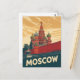 Det här snyggten-kortet innehåller en illustration av den ikoniska St. Basils katedral i Moskva, Ryssland, vintage-stil. Konstruktionen fångar upp de unika, färgstarka kupolerna och klassiska fästningsväggar med en plågad, bakre struktur. Den föränderliga paletten färg och den feta, plågade "MOSCOW"-typografin ge känner sig som en klassisk reseaffisch. Det är perfekten memento eller hälsning för alla älskare av resor, historia eller unika arkitekturer.
