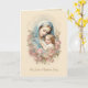 Detta vördnadsfulla katolska kort har en öm vintageillustration av den saliga jungfru Maria som omfamnar Kristusbarnet, infattad av en krans av mjuka blommor. Inskriptionen lyder "På din dopdag", vilket gör det till ett vackert välkomsttecken in i den heliga katolska kyrkan. Inuti talar ett hjärtligt meddelande om nåd, glädje och marianisk förbön, med helig skrift (Johannes 3:5) och en blomsterdekoration. En perfekt souvenir för ett gudbarn, barnbarn eller någon nyligen döpt själ.