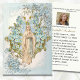 Minnas dina nära och kära i bön med denna vackra traditionella bilden av den Saliga Jungfru Maria, Vår Fru av Lourdes med blå Förgätmigej. All text och typsnitt kan ändras.