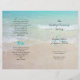 Programmall för stora katolska/kristna ceremonier för Beach-bröllopet, om du vill lägga till mycket text på alla fyra sidor. Den kristna skriften eller en vers kan läggas till på baksidan tillsammans med ett tack till familj, vänner och gäster. Scenblå havs-vatten och sandstrandbild på båda sidor av pappra som ska vikas efter köpet.