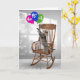 Spelande tabby katt står på en gungande trästol och når en färgfull ballongbukett för 75:e födelsedag. Åldersnumret kan ändras.