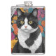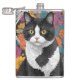 En svart-vit katt sitter omgiven av en mängd färggranna blommor i nyanser av orange, blå, rosa och gul. Bakgrunden är fylld med ett tätt, invecklat blommönster som framhäver kattens fängslande gula ögon.