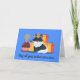 Skicka födelsedagshälsningar. Cute Black and white cat blåser ut ljus på en cupkaka. Presenter bakom kattunge och en blå bakgrund.