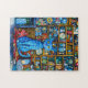 Blåsvart katt sitter framför en hylla fylld med roliga, karikatyrer i ett modernt, ljust stil.