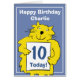 Roligt tecknad-katt håller en tavla som visar födelsedagets ålder. Anpassa med namn och ålder och lägg till ditt eget budskap inuti. Kort för kattälskarbarn. Kid som tycker om katter. Födelsedag för barn som kärlek katter. 10 år gammal. Ålder 10, 10:e födelsedag.