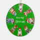 Denna ljusa, färgstarka ornament har alla typer av katter som ligger uppför sig kant om prydnadsämnet. De visar upp sina festliga helgdag, hattar, scarfar och tomater. I mitten står det "Mee-owy jul". Allt står mot grönt glitter bakgrund. Utformningen är också på den motsatta sidan och du kan anpassa den med presentgivarens och mottagarens namn, samt året.