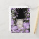 En digital illustration av en linje teckning från en katt i lila blommor.