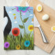 Cute black and white kattunge med ett vitt kärlek hjärta på bröstet och en skarp grönt ögon sitta i en lång grönt gräs. Hon är omgiven av många söt färgstarka blommor. Löv och små blommor flyter runt henne och en fjärilspett runt hennes huvud. Digital abstrakt folk art designad av C.Katt.