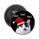 Tekigt fotografi av en grumlig katt som bär en julhatt på julöppningen flaska.