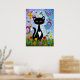 En svart-vit katt i smoking som sitter bland gräset och blommorna i en färgrik trädgård. Runt omkring henne finns blommor och blad och färgglada former. Hon har de vackraste gröna ögon och bär en röd halsband.