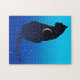 Pussel i en silhuett av en sitta-katt i elegant med mönster från himlar och halvmåns måne på en nattblå, stjärnblå bakgrund