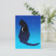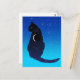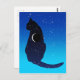 Vykort i ett silhuett av en sitta-katt i elegant med mönster med stjärnbädd himlar och haltande måne på en kvällsblå, stjärnbakgrund