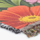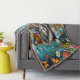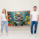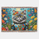 En majestät blå katt, försedd med en ornat, jewelliknande krage, sitter mitt i en levande fält av färgstarka vilda blommor. Butterflies florerar runt i det ljusa himmel, vilket ökar den vita, livliga atmosfären.