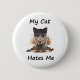 Den här knappen visar en mörkt lustig illustration av en arg katt, som leker på den klassiska stereotypen att katter är ensamma, kall eller till och med öppet fientligt mot sina ägare. Den fångar katternas humor som små tyranner som styr huset och tolererar människor endast på egna villkor.