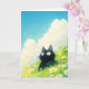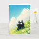 Den här charmiga vykorten presenterar en bedårande svart katt med stora, nyfikna ögon, sittande mitt i en livfull äng med vårblommor under en klarblå himmel med ludna moln. Kattens ludna päls och uttrycksfulla blick ger en lekfull, fantasifull touch och skapar en förtjusande scen som fångar essensen av en sorglös, solig dag. Detta kort är perfekt för kattälskare och naturentusiaster, med sin blandning av sötma och lugn. Lämpligt för alla tillfällen är detta kort ett underbart sätt att ge någon ett leende och fira naturens och samvarons skönhet.
