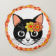 Katt med blommig huvudprydnad omgiven av dekoratio rund kudde