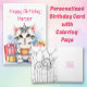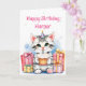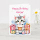Cute-födelsedagskort för flickor. Söt för ett barn eller en vuxen. En vit och grått kattunge som håller en födelsedagskalas omgiven av gåvor. Du kan anpassa kortet genom att lägga till en namn i personaliseringsområdet. Späd valp och födelsedag inuti tillsammans med en färgsida. Cute rosa, lila, grönt och blått.