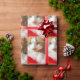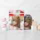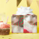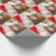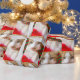 Orange och vit katt med en färgstark muffler bredvid ett hårig julhat