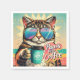 Katt med överdimensionerade solglasögon och kaffe pappersservett