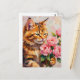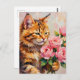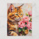 Bilden visar ett flytande, orange och svart tabby katt med grönt ögon, placerat bredvid en bukett av rosa ros. Katten tittar något till högerna med ett serenuttryck. Ro är i fullt blomning, med löv av grönt synliga. Bakgrunden är en mjuk blandning av rosa och beige som skapar en mjuk och varm atmosfär.