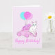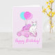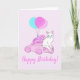 Hälsningskort med en söt vit katt med turkos ögon sitta på en rosa som är fylld med rosa och lila presentlådor och ballonger i färger, lila och turkos. Perfekt kort för en kattälskare! Designen är anpassade och du kan anpassa texten.