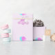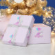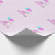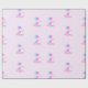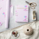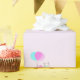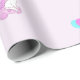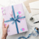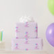 Förpackning papper med en söt vit katt med turkos ögon sitta på en rosa som är fylld med presentlådor för rosa och lila och ballonger i rosa, lila och turkos färg. Utformningen är anpassade.