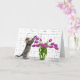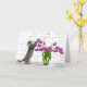 Grått tabby katt leker med rosa tulip bouquet på tegel för födelsedagspresent.