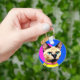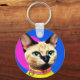 En närbild av en katt som bär en halsband, inramad i en rund spegel mot en färgrik bakgrund, som visar dess ljusa ögon och unika egenskaper.