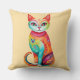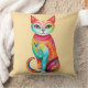 En sjudande färgad-katt avbildas med mönster och en viskartad utformning med rosa, grönt och orange. Dess stora ögon och lekfulla uttryck bidrar till det livliga och uppfinningsrika stil.