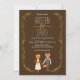 Den här charmerande bröllopsinbjudan innehåller ett höftkatt- och rävpar omgivet av ram i handdragna löv i en arrangemang av krans.