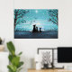 Två hundar och kattsilhuett tittar på solnedgången på vintern kväll. I färg av blått, svart och vitt. Två träd på båda sidor och fåglar flyger mot solnedgången. Snöflingor faller och några ljusa stjärnor i himlar. Winter scenery Original Acrylic Painting Art gjord av Donna Leger for Irony Design. Alla rättigheter förbehållna