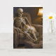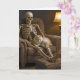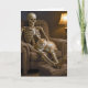 Ett skelett sitter i en plusstol bredvid en fluffy orange katt, båda belysta av den mjuka glöden från en närliggande lykta. Text kan ändras.