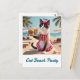 "Ta med en liten bit roligt och stollig till stranden party med det här charmerande vykortet, med en katt som serverar en utsökt hamburgare! Perfekt för både kattälskare och katter, den här bilddesignen fångar den karefria vibe som finns på stranden firande. Vare sig det är en sommar party, en födelsedag eller en avslappnad, är det här vykortet perfekten till inbjudan dina gäster till en stranddag full med roligt, mat och kattdjur."