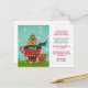 En julparsinbjudan med vykort med en bild av en hedervärd orange katt sitta i tekopp. Varma vinterkläder. Snöflingor faller mot en ljust grönt bakgrund. Julgran gräns längs grund.