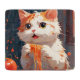 En flytande vit katt som är full med bruna prickar, dykar huvudvärst in i ett berg av spaghetti. Tomatsåsen stänker över päls och den vita bordduken på en härlig . I en häpnadsväckande, mästerligt balanserad sammansättning (tänka gyllene förhållande!) ger illustrationen en antydan om det detaljerade, men ändå nykterliga.