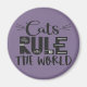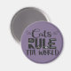Roligt och härlig modern kylmagnet för lila med ord "Katt styr världen", dekorerad med vita whiskers, kattrepor, en liten mus och lite tass.