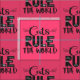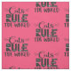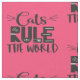 Ett trendig och ett vackert mönster med orden "Katt styr världen" i svart typsnitt, dekorerat med vita whiskers, kattrepor, en liten mus och lite tass på rosa.