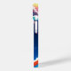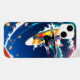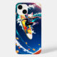 Quirky skeleton-katt som surfar på en candy corn-våg under en neon Halloween himmel. Roligt och färglös skokusdesign.