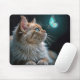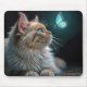 En fluffig katt med skarpa blå ögon gazes märkligt på en glödande fjäril som ligger i närheten