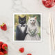 Två katter är klädda i bröllopskläder, en i smoking och den andra i en brudklänning, och håller en brudbukett