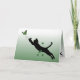 En svart katt med grönt synar banhoppning i den pröva luften för att fånga en härlig grön fjäril.