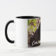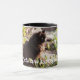 Svart kattsitta i trädgårds- solbadning hon själv på kaffemuggen