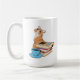 Söt orange katt, blå kaffekopp och hög med böcker. Bokälskare citat kaffemugg.