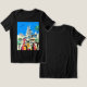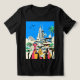 T-Shirt på en illustration av tre snyggtar, katter klädda som turister som står framför ett futuristiska cityscape. Arkitekturen väcker sci-fi-tetik i mitten av århundradet. Katterna håller kameror, kartor och bära lanyards, vilket tyder på äventyr. Handflatan träd och ett starkt blå himmel förbättrar semesterstämningen.