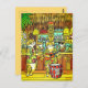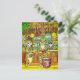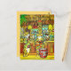 Vykort i en tropiskt tematisk illustration som skildrar katter på en tiki pub. En katt som trycks i klara hawaiiska skjortor spelar en ukulele och står nära en röd trumma, medan andra njuter av cocktails. Pub har bamboosdecor, tiki masker och handflatan fronder för en festlig öatmosfär.