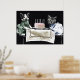 Ett foto av vintage på två klädda katter sitta i en stol på en bord, som firar en födelsedag med tårta och ljus. Anpassa genom att lägga till en egen text.