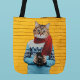Hände till saker i stil med hjälp av detta söta och krångliga kattunge. Den här tote-väskan har ett foto av stil som illustrerar en katt som är klädd i en stil-sötare och som innehåller en vintage kamera. Tabby i sin röda halsduk och blå svettare ställs mot en brickvägg med ljusa gulter.