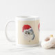 Kattjul, en gullig illustration som presenterar en persisk katt som ha på sig Santas hatt. Huvudsakliga färger: beige, vit, rött, grå färg, svart och gult. Den original- teckningen gjordes med färgpennor av konstnär© E.D. Siffert.