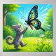 Den här vita poster har en färgstark fjäril och en vänlig grått-katt som leker utanför. Avslutat i ett oljefärgtryck.